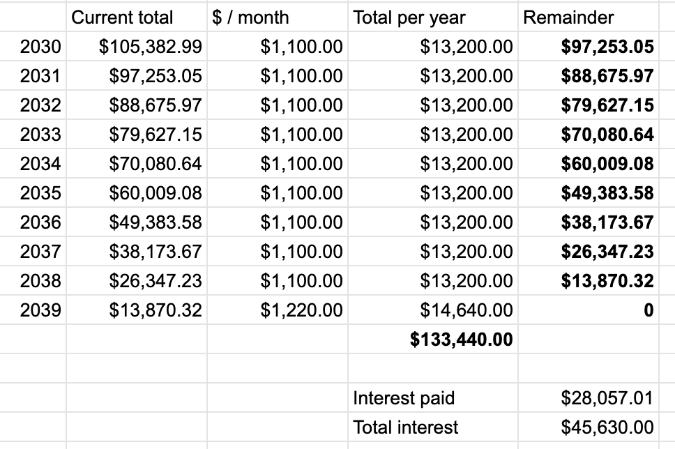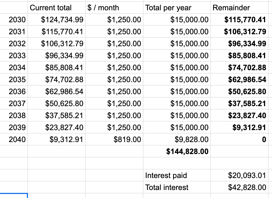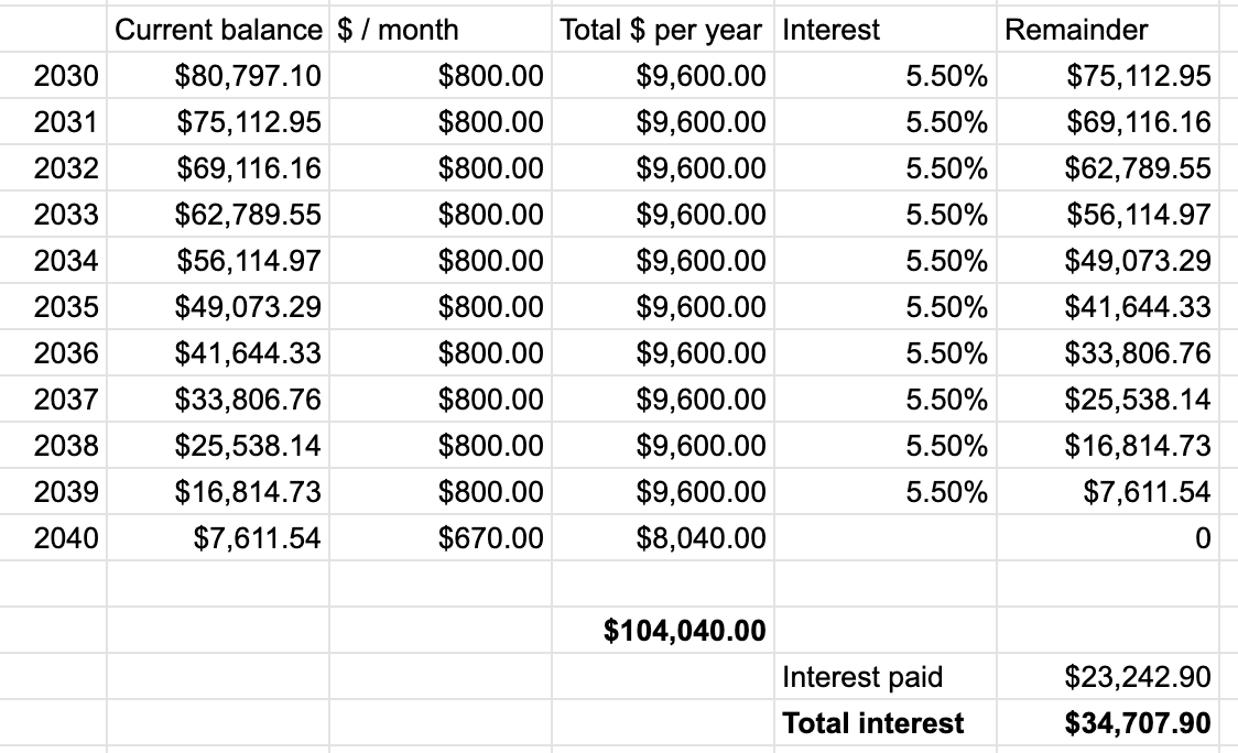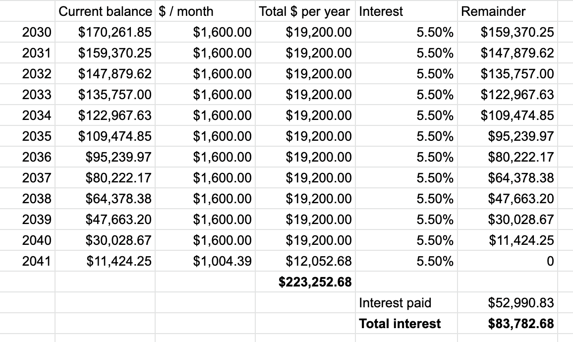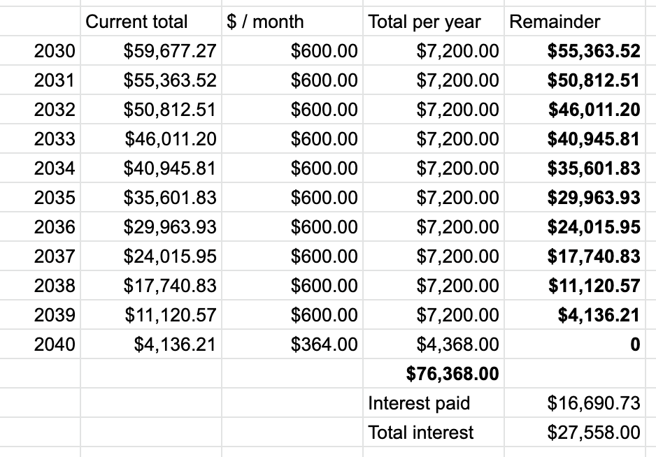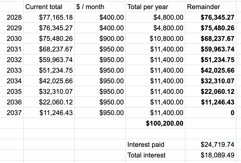 Notice that a monthly payment of $400 starting in 2028 and continuing through the end of 2029 effectively wipes out and even exceeds the effect of the interest which accrued over the previous 3 years.