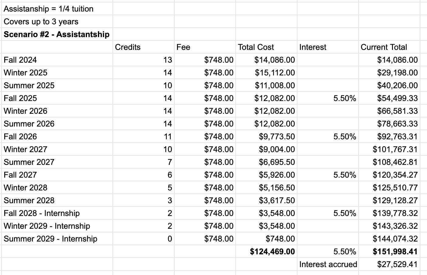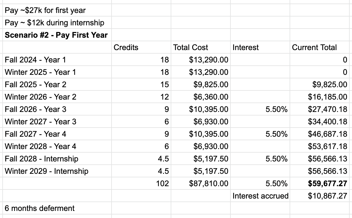 In this scenario, we assume that you pay everything using loans with a 5.5% interest rate (which is perhaps generous in our current inflationary environment), and either don’t qualify for or don’t take advantage of the university’s limited assistantships. In future scenarios, we’ll factor in the assistantship to see how a few minor changes can affect (or don’t affect) the final cost.
