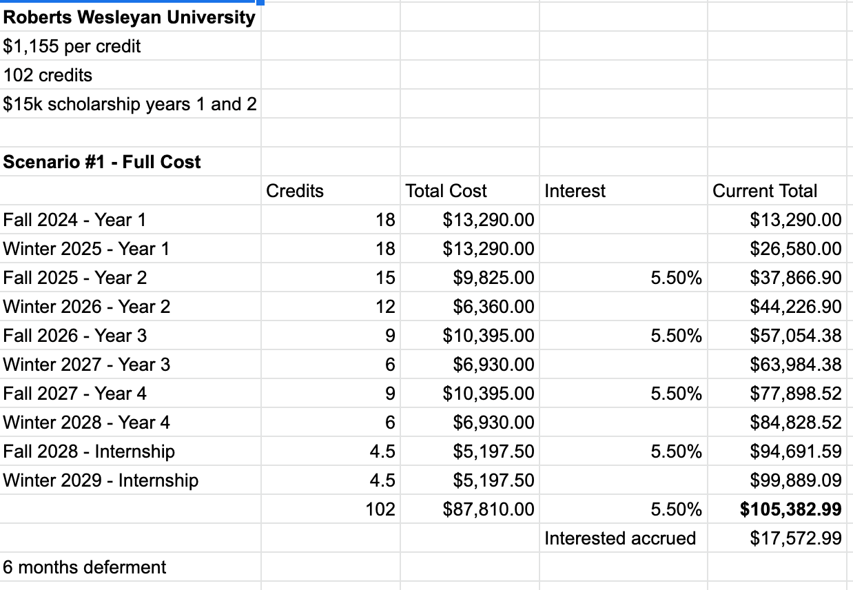 Despite having a higher cost per credit, Roberts Wesleyan University ends up costing less because they offer a targeted scholarship, and don’t have the mandatory flat semester registration fee. By the end of the 5 year program, the student has accrued $105,000, and only ~$18,000 of this is interest on the principal.