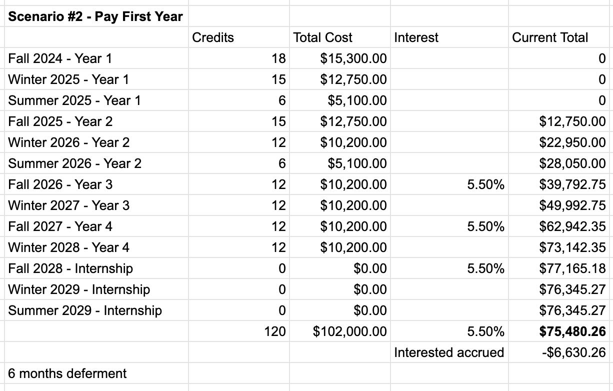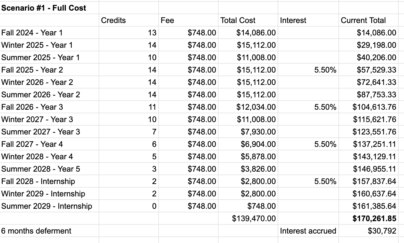Notice the difference between the price tag ($139,470) which is based on the price per credit ($1026) and the flat semester fee ($748), and the final loan balance accrued over the five years ($170,261.85).