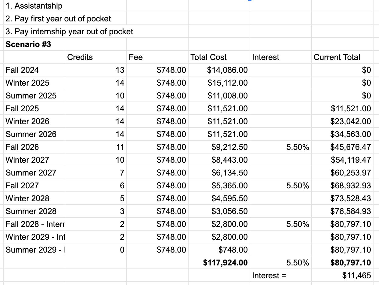 So, if I (1) pay the first year out of pocket, (2) use the assistantship, and (3) pay for the final year’s fees from my internship salary, where does that get me?
