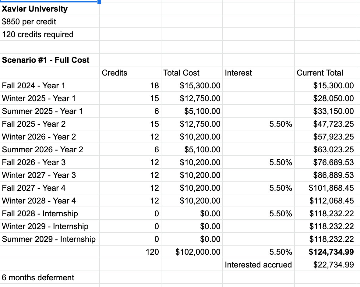 You don’t see any fall or winter semesters where the student is taking 6 or 9 credits. Instead, you see 12’s and 15’s mostly across the board. While this means that every semester is consistently high, the cost is spread more evenly so interest is not snowballing on you quite so dramatically. Plus, Xavier’s cost per credit hour is also the cheapest I’ve seen in my research.