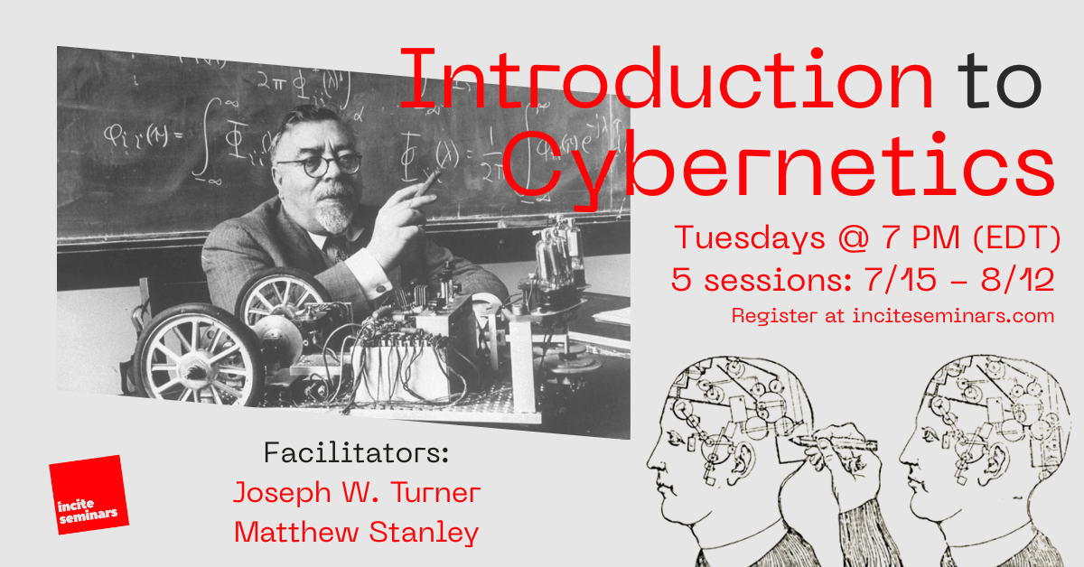 For five weeks from July to August, I enjoyed co-teaching "An Introduction to Cybernetics" with Joseph W. Turner, a friend I had met through Incite Seminar. Joseph is working on a PhD at UW-Madison, and had spent quite a bit of time studying things I was also interested in – cybernetics, Japanese philosophy, Agamben, anarchism – so we decided to team up and teach a course together. I had never taught with another person before, but the experiment was a resounding success, and I think the combination of both our approaches added a rich depth to the learning experience.