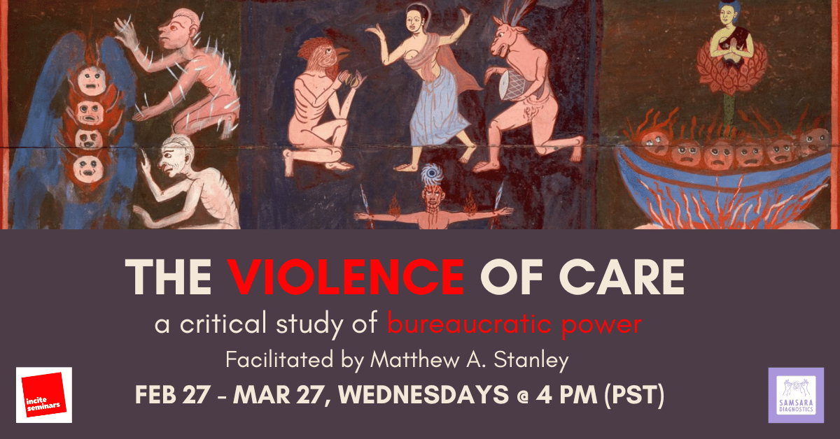 In February 2025, I taught "The Violence of Care: A Critical Inquiry into Bureaucratic Power" as an attempt at a micro-version of the course, to see what felt most important about the project and how others might receive its ideas. The seminar had learners reading Michel Foucault, Ivan Illich, Bruno Rizzi, James Burnham, David Graeber, and James C. Scott, looking at the ways that bureaucratic governing apparatuses change our individual and communal perception, expand through the production of harmful outcomes, and leave us more dis-abled precisely through their efforts to help us.